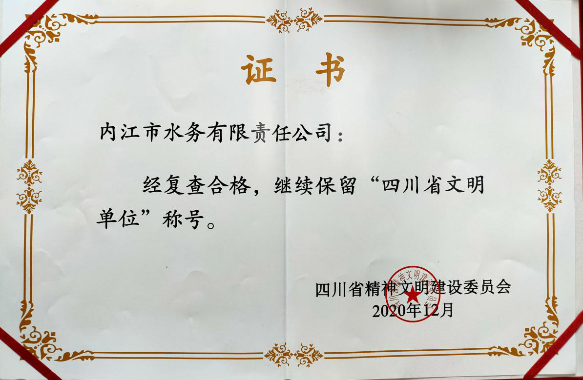 近年來,市水務(wù)公司黨委始終以*新時(shí)代中國特色社會(huì)主義思想為指導(dǎo),推進(jìn)精神文明建設(shè)工作不松勁,抓好生產(chǎn)經(jīng)營工作促發(fā)展,推動(dòng)公司精神文明和物質(zhì)文明建設(shè)的雙豐收。根據(jù)四川省精神文明建設(shè)委員會(huì)《關(guān)于復(fù)查確認(rèn)繼續(xù)保留稱號的四川省文明城市、文明村鎮(zhèn)、文明單位、文明家庭、文明校園的通報(bào)》(川文明委〔2020〕20號),內(nèi)江市水務(wù)有限責(zé)任公司順利通過復(fù)查,繼續(xù)保留“四川省文明單位”榮譽(yù)稱號。