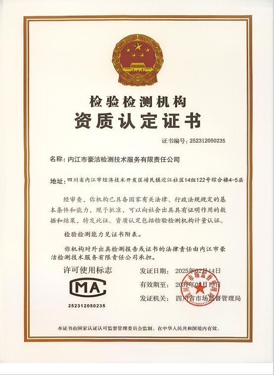 經(jīng)四川省市場監(jiān)督管理局批準(zhǔn),內(nèi)江市豪潔檢測技術(shù)服務(wù)有限責(zé)任公司正式取得《檢驗(yàn)檢測機(jī)構(gòu)資質(zhì)認(rèn)定證書》,此項(xiàng)資質(zhì)的取得標(biāo)志著我司在檢驗(yàn)檢測方面已達(dá)到了國家相關(guān)標(biāo)準(zhǔn)和要求,具備了向社會提供公正、準(zhǔn)確的檢測服務(wù)資質(zhì)和能力。